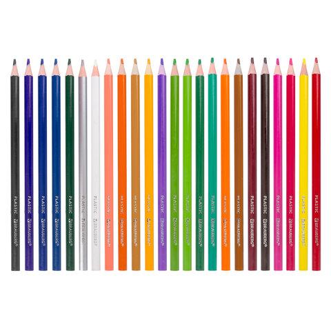 Набор состоит из 24 цветов: черный, темно-синий, синий, голубой, салатовый, зеленый, темно-зеленый, болотный, серо-зеленый, желтый, оранжевый, темно-оранжевый, персиковый, фуксия, розовый, красный, темно-красный, бордовый, песочный, серый, светло-серый, фиолетовый, темно-коричневый, коричневый. Трехгранная форма сечения корпуса позволяет не скатываться карандашу с поверхности стола во время занятий рисованием. Карандаши изготовлены из высококачественного материала и имеют лакированный корпус. Качество исполнения гарантирует легкую заточку. Грифель диаметром 3 мм обладает повышенной прочностью. Все карандаши заточены и поставляются в картонной упаковке с европодвесом.