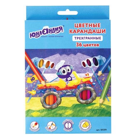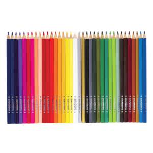 Набор состоит из 36 цветов: темно-синий, синий, фиолетовый, сиреневый, пурпурный, коралловый, розовый, бежевый, бледно-розовый, бордовый, красный, алый, темно-оранжевый, канареечный, оранжевый, желтый, бледно-желтый, белый, серебристый, золотистый, черный, серый, темно-зеленый, болотный, зеленый, бирюзовый, салатовый, бледно-зеленый, светло-серый, темно-коричневый, коричневый, каштановый, светло-коричневый, песочный, голубой, синий. Яркие цвета развивают цветовосприятие ребенка. Шестигранная форма сечения корпуса позволяет не скатываться карандашу с поверхности стола во время занятий рисованием. Они изготовлены из древесины ценных пород и имеют лакированный корпус. Высокосортная древесина и качество исполнения гарантируют легкую заточку. Мягкий грифель качества «А» диаметром 3 мм обладает повышенной прочностью, не ломается и не крошится при заточке. Все карандаши заточены и поставляются в картонной упаковке с европодвесом.