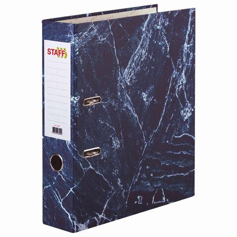 Папка формата А4 с вертикальной ориентацией изготовлена из качественного картона с покрытием под мрамор. Ширина корешка в 70 мм позволяет разместить до 500 листов. Прорези для колец на внешней крышке позволяют оставаться папке закрытой даже при большом количестве бумаг, а надежный арочный механизм легко справляется с ежедневными нагрузками. Корешок снабжен этикеткой для маркировки содержимого, что позволяет структурировать информацию.