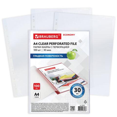 Перфопапки формата А4 с вертикальным размещением содержат универсальную перфорацию, а также имеют гладкую поверхность и прочные швы. Файлы являются незаменимым атрибутом в офисе, позволяют систематизировать документы и обеспечивают их сохранность на долгое время. Изготовлены из пленки толщиной 30 мкм. В комплект входит 100 перфопапок.