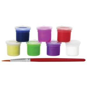 В набор входят: 7 акриловых красок по 3 мл каждая, лист для тренировки, картонная основа с нанесенным контуром формата А4 (210х297 мм), синтетическая кисть.