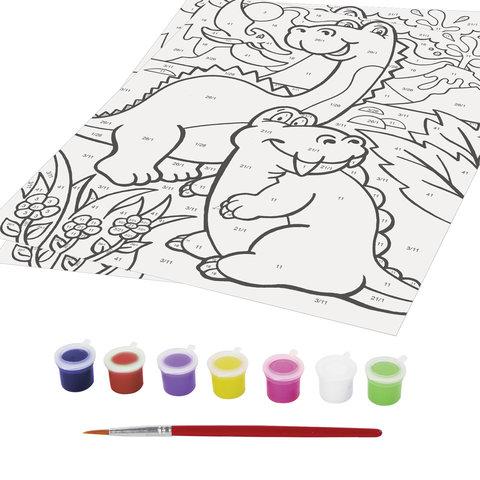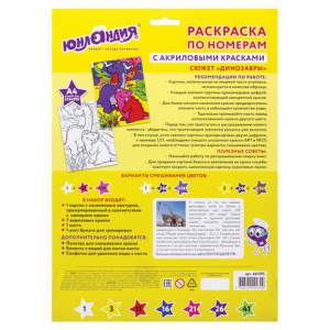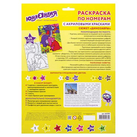 Раскраска А4 по номерам ЮНЛАНДИЯ "Динозавры" 4стр. с акриловыми красками арт. 661595