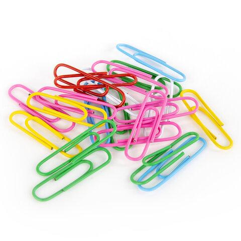 Скрепки изготовлены из стали, имеют классическую овальную форму и цветное пластиковое покрытие. Длина скрепки составляет 33 мм. Не окисляются и не повреждают документы. 100 штук в картонной коробке.