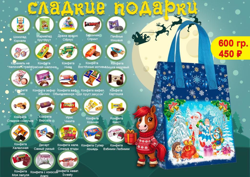 Практичный вариант подарка: Яркая экономичная упаковка и большой выбор сладостей для маленьких сладкоежек .