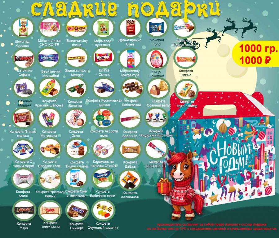 Производитель оставляет за собой право изменить состав подарка на 15% не более, при этом качественные и стоимостные характеристики не поменяются, то есть заменить какую либо конфету на равную ей по цене и по вкусовым характеристикам.