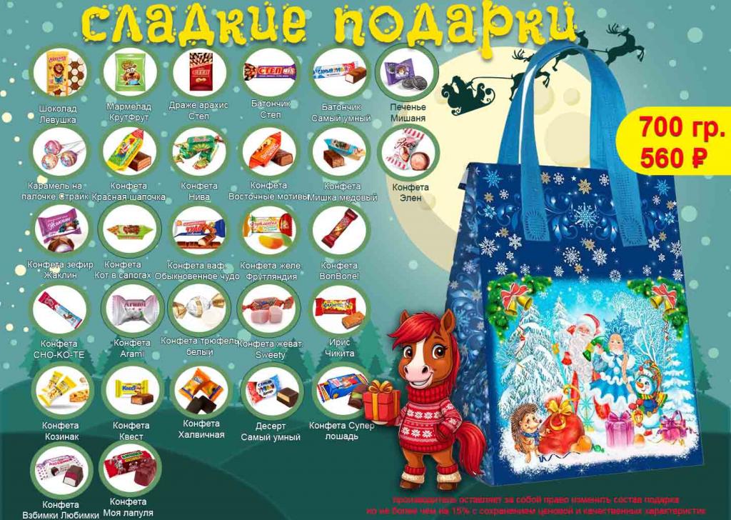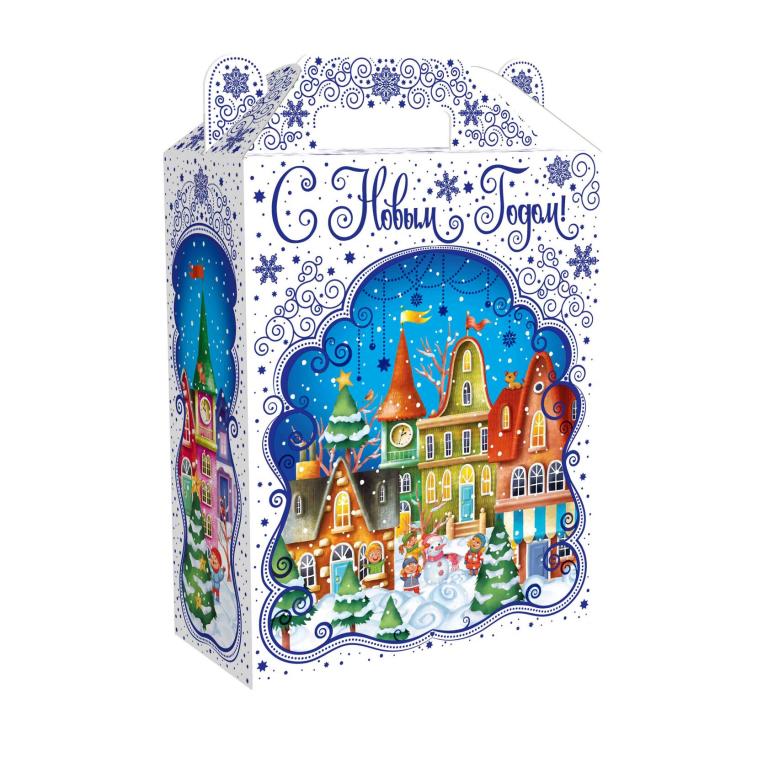 Большой набор сладостей в яркой упаковке порадует детишек в зимний праздник . Когда в подарке почти килограмм сладостей каждый сладкоежка точно найдет в нем что-то по душе.