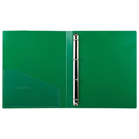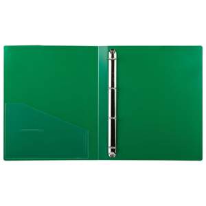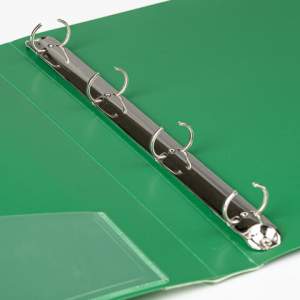 Папка стандартного формата А4 вмещает до 170 листов. Изготовлена из высококачественного пластика толщиной 0,7 мм зеленого цвета со стандартной фактурой. Допускается влажная обработка поверхности. Внутренняя сторона обложки снабжена прозрачным карманом. Для идентификации содержимого на корешке папки имеется карман. Ширина корешка составляет 25 мм. Папка оснащена четырьмя кольцами, которые обеспечивают надежное хранение документов. В неё можно вставлять файлы или проколотые дыроколом листы и, при необходимости, заменять их на другие. Каждая папка упакована в индивидуальный пакет.