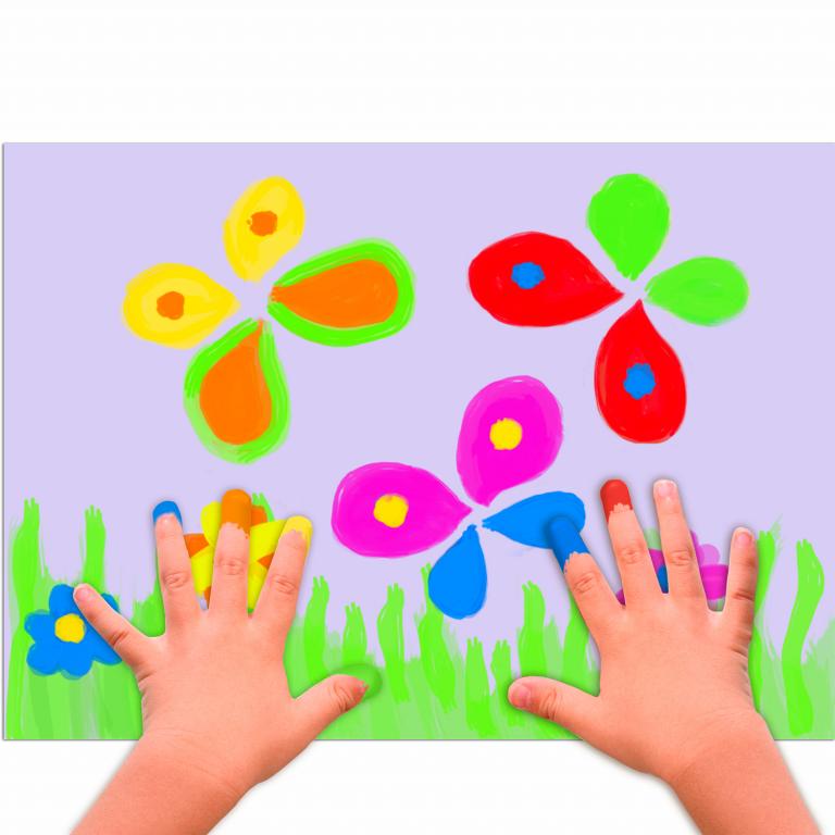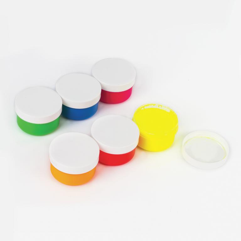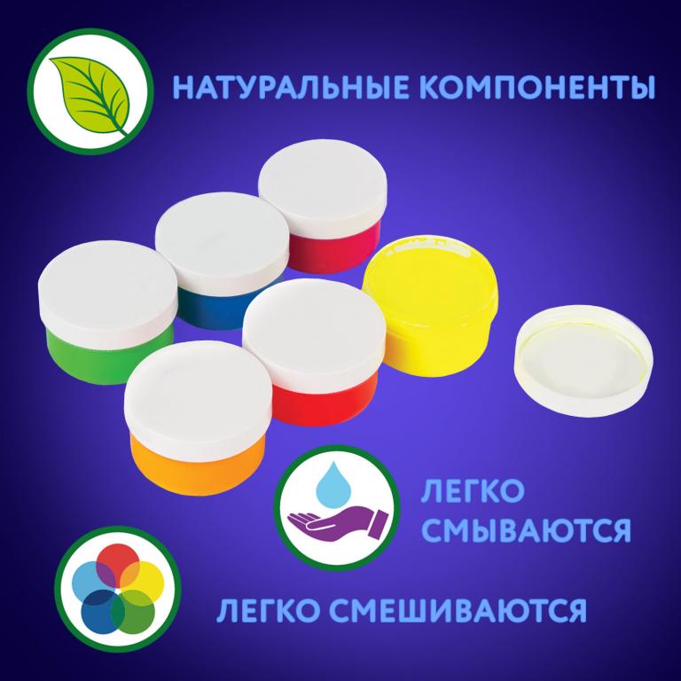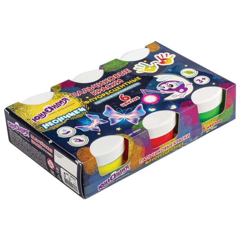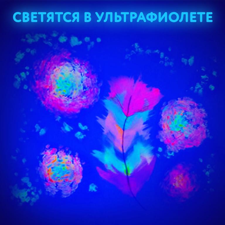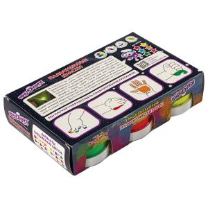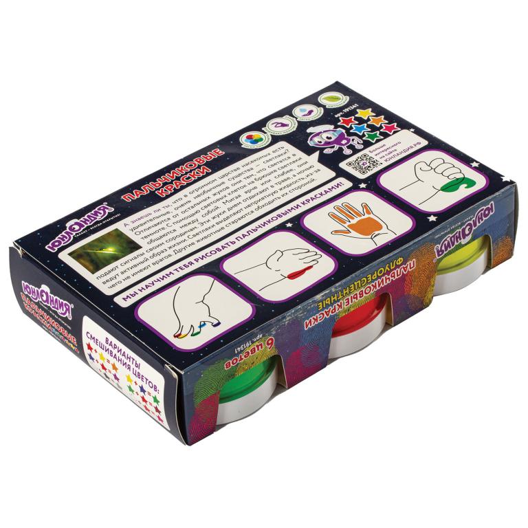 В наборе 6 ярких цветов, светящихся в ультрафиолете. Краски выполнены на основе натуральных компонентов, не токсичны. Приятная муссовая текстура помогает краскам не растекаться по ручкам малыша, но позволяет ему делать яркие рисунки. Пальчиковые краски легко смываются с рук, без труда отстирываются с одежды. Натуральные природные красители в составе могут незначительно окрашивать некоторые поверхности. Краска упакована в пластмассовые герметичные баночки объемом 60 мл. Общий объем — 360 мл.