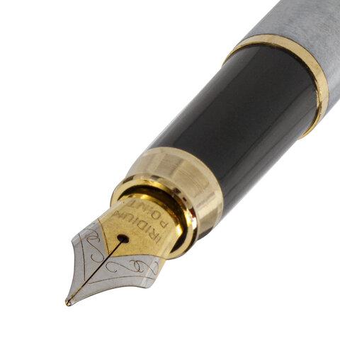 Стильная модель перьевой ручки с корпусом из металла серебристого цвета и золотистыми деталями. Синий цвет чернил, иридиевое перо украшено гравировкой. Диаметр пишущего узла 0,5 мм. Тип пера M (Medium) — средняя ширина линии. Поставляется в фирменной упаковке.