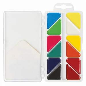 Содержат 12 ярких цветов. Обладают отличной укрывистостью и высокой светоустойчивостью, прекрасно смешиваются и сохраняют яркость при высыхании. Отлично ложатся на бумагу. Изготовлены с добавлением патоки. Нетоксичны. Удобная треугольная форма кюветов. Имеется отделение для кисточки. Поставляются в пластиковой коробке с европодвесом.