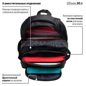 — Боковые сетчатые карманы подходят для хранения бутылок с водой и зонта. Передний карман на молнии для быстрого доступа к вещам первой необходимости.