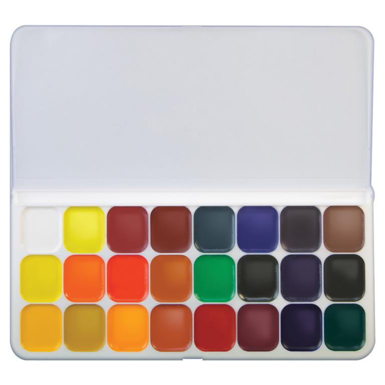 Цвета: белила, желтый, лимонный, желтый темный, желто-оранжевый, оранжевый, охра, алый, карминовый, розовый, бордо, фиолетово-розовый, фиолетовый, голубой, синий, лазурно-голубой, желто-зеленый, изумрудно-зеленый, зеленый оригинальный, зеленый, охра красная, железоокисный светло-красный, коричневый, черный.