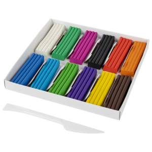 В состав набора входит 12 брусков по 20 г разных цветов: белый, черный, синий, красный, зеленый, желтый, светло-зеленый, коричневый, голубой, оранжевый, лиловый, фиолетовый. Масса набора — 240 г. Стек в комплекте.