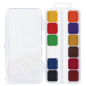 12 ярких насыщенных цветов отлично смешиваются между собой и позволяют создать множество оттенков, обеспечивают однородное окрашивание. Краски быстро высыхают и не портятся со временем. Безопасны для детей, нетоксичны. Выпускаются в пластиковом пенале с прозрачной крышкой, квадратной формой кювет и отделением для кисточки. Упаковка обладает компактными размерами и легким весом.