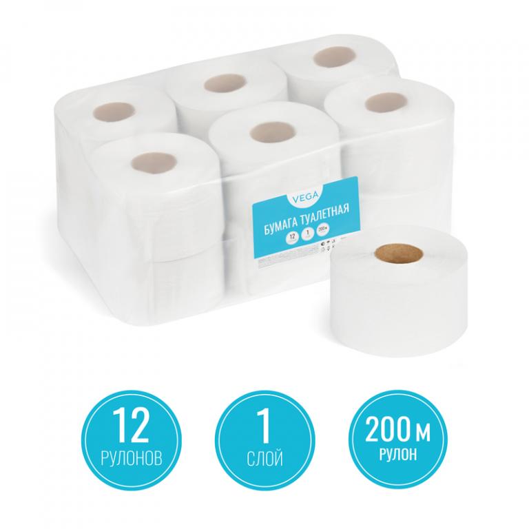 Однослойная туалетная бумага Vega Professional белого цвета представлена по 12 рулонов в полиэтиленовой упаковке.