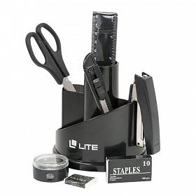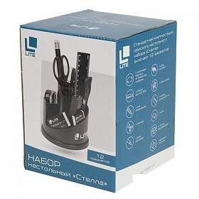 Настольный набор LITE Стелла, компактный и практичный. Состоит из прочной округлой пластиковой подставки с отделениями и набора самых необходимых канцелярских принадлежностей. Модель доступна в чёрном цвете.Стандартная комплектация настольного офисного набора Стелла включает 12 предметов:, 1 пластиковая подставка на поворотной платформе, 1 степлер для скоб №10, 1 нож канцелярский, 1 ножницы, 1 ручка шариковая, 1 набор скоб №10, 1 набор скрепок, 1 линейка со шкалой 15 см, 1 ластик, 1 точилка для карандашей, 2 карандаша с ластиком.