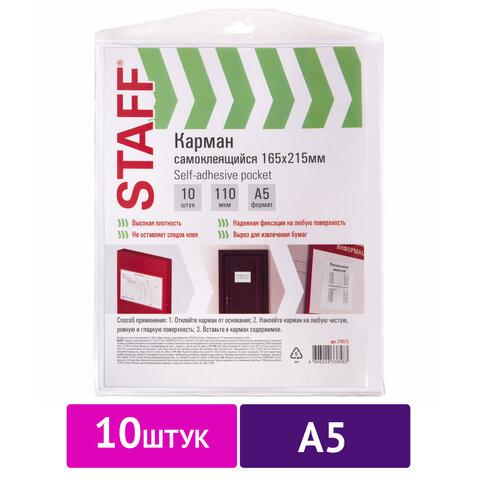 Самоклеящеся карманы STAFF под листы формата А5 предназначены для размещения информации на папках, досках для объявлений и любых других ровных поверхностях.