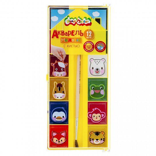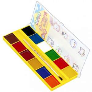 Акварель 12 цветов с кистью в ярком жёлтом пенале в эксклюзивном цвете Каляка-Маляка®! Каждая кювета украшена своим персонажем, чтобы ребенок мог запоминать цвета. Пленка защищает краски от перетекания и попадания пыли.