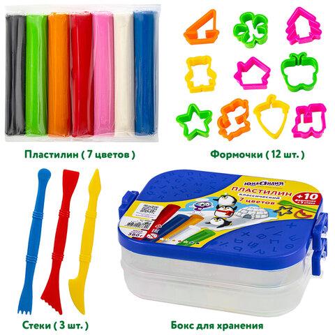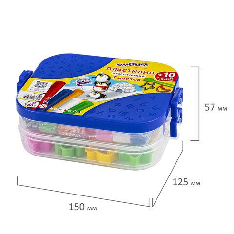 В наборе 7 брусков белый, желтый, красный, синий, черный, оранжевый, салатовый, каждый из которых упакован в прозрачный пакет, а также 10 формочек, 3 стека.
