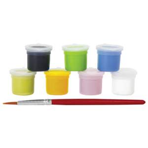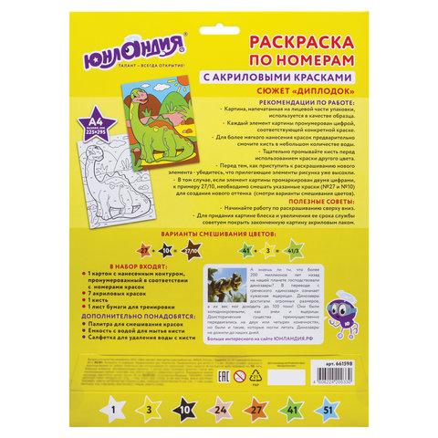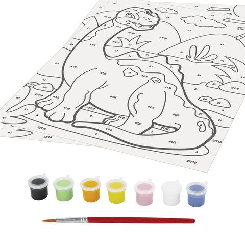 В набор входят: 7 акриловых красок по 3 мл каждая, лист для тренировки, картонная основа с нанесенным контуром формата А4 (210х297 мм), синтетическая кисть.