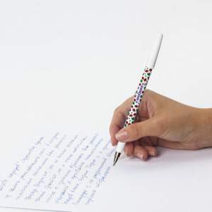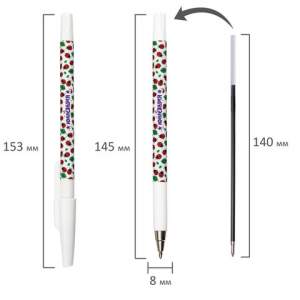 Шариковая ручка с SOFT TOUCH покрытием на корпусе и изображением божьих коровок. Ручка имеет удобную прорезиненную зону захвата и стандартный наконечник. Диаметр пишущего узла, равный 0,7 мм, создает линию письма, равную 0,35 мм. Длина сменного стержня составляет 140 мм. Цвет чернил — синий.