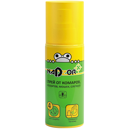 Средство обладает широким спектром репеллентного действия в отношении кровососущих насекомых (комаров, мокрецов, мошек и москитов). При распылении спрея от Nadzor молекулы действующего вещества - ДЭТА образуют на коже паровой барьер. N, N-диэтилтолуамид также влияет на нейроны и рецепторы комаров, которыми они обнаруживают такие химические вещества, как молочная кислота и углекислый газ, поэтому кровососущим насекомым не удается сесть на человека и укусить его.
