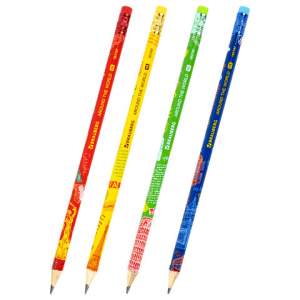 Каждый карандаш имеет индивидуальный штрих-код. Легко затачивается, максимально устойчив к повреждениям. Изготовлен из дерева высокого качества. Имеет круглое сечение и оснащен ластиком. Карандаш длиной 190 мм обладает средней степенью твердости – HB. Корпус покрыт цветной печатью ассорти в 4 дизайнах. Поставляется заточенным в пластиковой тубе по 72 штуки.