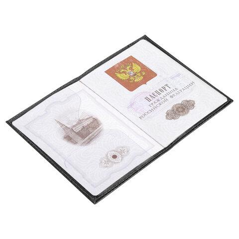 Модель выполнена из экокожи черного цвета и украшена тисненой надписью "Паспорт". Имеет простроченные края и мягкую изолоновую вставку. На внутреннем развороте расположены два кармана из прозрачного пластика. Благодаря компактным размерам 97х138 мм удобно всегда носить с собой.
