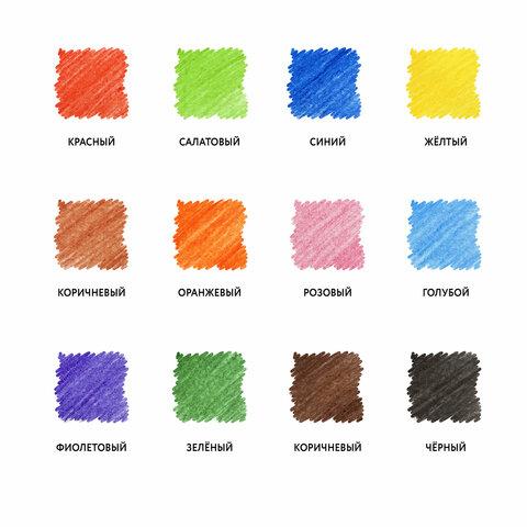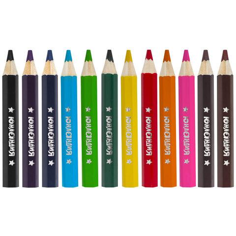 Набор состоит из 12 цветов: синий, фиолетовый, коричневый, красный, розовый, оранжевый, тёмно-коричневый, желтый, голубой, салатовый, зеленый, черный. Утолщенный шестигранный корпус удобен для захвата и снижает напряжение кисти при рисовании. Также подобная форма позволяет не скатываться карандашу с поверхности стола во время занятий рисованием. Укороченный корпус карандаша идеален для использования самыми маленькими любителями рисования. Карандаши изготовлены из древесины ценных пород и имеют лакированный корпус. Высокосортная древесина и качество исполнения гарантируют легкую заточку. Благодаря увеличенному грифелю диаметром 5 мм рисунок ляжет на бумагу густо, сплошной четкой линией. Все карандаши заточены и поставляются в картонной упаковке с европодвесом.