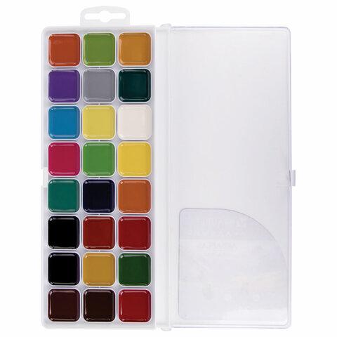 24 ярких насыщенных цвета отлично смешиваются между собой и позволяют создать множество оттенков, обеспечивают однородное окрашивание. Краски быстро высыхают и не портятся со временем. Безопасны для детей, нетоксичны. Выпускаются в пластиковом пенале с европодвесом, прозрачной крышкой, квадратной формой кювет и отделением для кисточки. Упаковка обладает компактными размерами и легким весом.