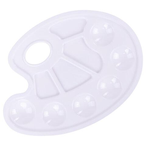 Легко отмывается после использования. Имеет 4 отделения для смешивания красок и 6 отделений для размещения красок. Палитра овальной формы с отверстием для удобства держания в руке изготовлена из высококачественного полистирола белого цвета. Размер - 23х17х0,8 см.