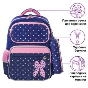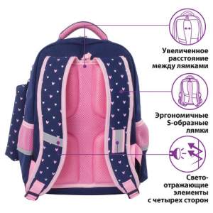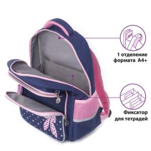 Рюкзак снабжен усиленной ручкой из ткани и петелькой для подвешивания на крючок, а также фиксатором для тетрадей. Светоотражающие элементы с четырех сторон обеспечивают безопасность в темное время суток.
