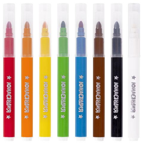 Фломастеры обладают яркими насыщенными цветами в количестве 7 штук + 1 белый фломастер-стиратель, который позволяет стирать остальные цвета. Круглая утолщенная форма корпуса, длина которого 136 мм, а диаметр — 12 мм. Благодаря толщине линии письма 2 мм и диаметру пишущего узла 5 мм процесс раскрашивания становится легким. Длина письма составляет 450 м: такого расхода хватит надолго. Фломастеры изготовлены на водной основе, поэтому они безопасны и легко смываются с большинства материалов и кожи. Утолщенный наконечник, устойчивый к продавливанию, не проваливается внутрь корпуса и не деформируется даже при сильном нажатии. Полипропиленовый корпус значительно продлевает срок службы фломастеров. Колпачок имеет специальные прорези для вентиляции, которые способствуют прохождению воздуха при попадании в дыхательные пути ребенка. Рекомендованы для детей от 3-х лет.