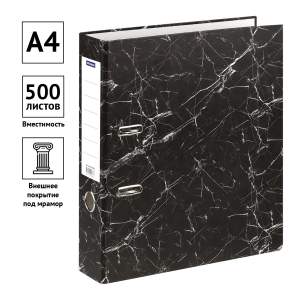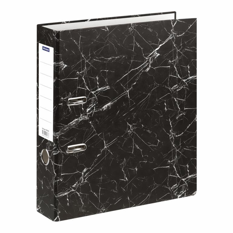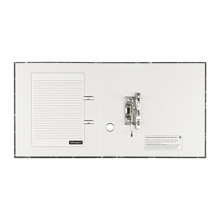 Папка-регистратор OfficeSpace формата А4 – отличный помощник для хранения и систематизации документов. Ширина корешка – 75 мм. Папка чёрного цвета вмещает до 500 листов. Размер – 290*320*75 мм. Папка-регистратор с вертикальной ориентацией имеет внешнее покрытие из офсетной бумаги «мрамор». На корешке есть сменный вкладыш для записей. Внутренняя часть папки выполнена из офсетной бумаги.