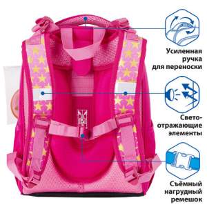 Яркие звёзды на передней панели ранца выполнены переливающейся золотой краской, а сменные патчи позволят ребёнку самостоятельно выбирать тот или иной дизайн на своё усмотрение.