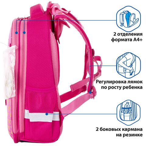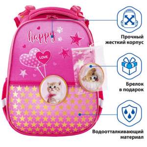 Яркая этикетка расположена на передней стороне ранца, делая его более заметным на полке магазина, а информация в ней отражает главные потребительские свойства, помогая покупателю принять решение о покупке.