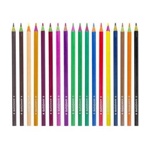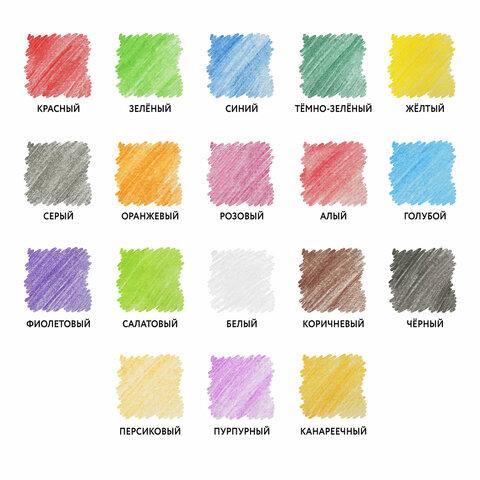 Набор состоит из 18 цветов: белый, красный, алый, розовый, пурпурный, желтый, канареечный, оранжевый, персиковый, салатовый, зеленый, темно-зеленый, голубой, синий, фиолетовый, коричневый, серый, черный. Яркие цвета развивают цветовосприятие ребенка. Трехгранная форма сечения корпуса позволяет не скатываться карандашу с поверхности стола во время занятий рисованием. Они изготовлены из необычного пластика разных цветов и имеют лакированный корпус. Качество пластика гарантирует легкую заточку. Мягкий грифель с диаметром 3 мм обладает повышенной прочностью, не ломается и не крошится при заточке. Все карандаши заточены и поставляются в картонной упаковке с европодвесом.