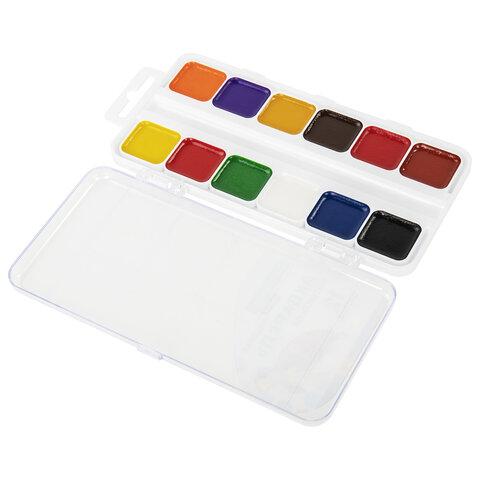 12 ярких насыщенных цветов отлично смешиваются между собой и позволяют создать множество оттенков, обеспечивают однородное окрашивание. Краски быстро высыхают и не портятся со временем. Нетоксичны и безопасны для детей. Выпускаются в пластиковом пенале с европодвесом, прозрачной крышкой, квадратной формой кювет и отделением для кисточки. Упаковка обладает компактными размерами и легким весом.
