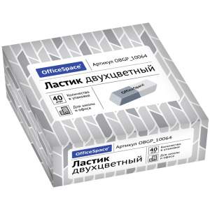 Ластик OfficeSpace размером 41*14*8 мм имеет прямоугольную/скошенную форму. Товар выполнен из термопластичной резины. Ластик позволяет чисто удалять следы от чернографитных карандашей. Изделие выпускается в комбинированном белом/сером цвете. В упаковке представлено 40 штук. Материал: термопластичная резина; Форма: прямоугольная/скошенная; Размер: 41*14*8 мм; Цвет: белый/серый.