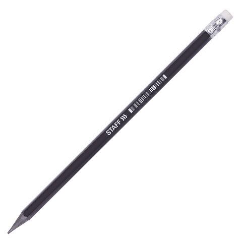 Изготовлен из пластика, оснащен ластиком. Имеет шестигранное сечение. Карандаш длиной 185 мм легко точится и не крошится. Выполнен в черном цвете. Поставляется заточенным.