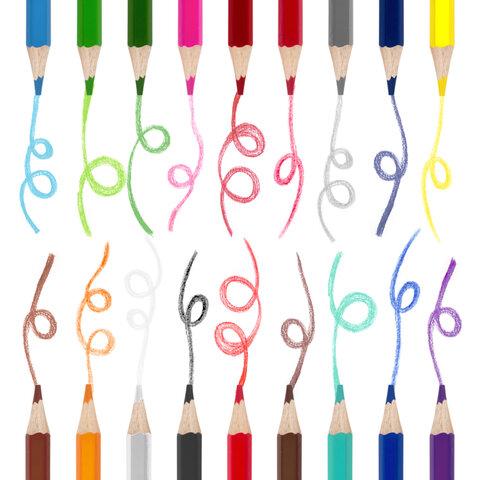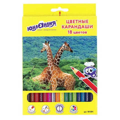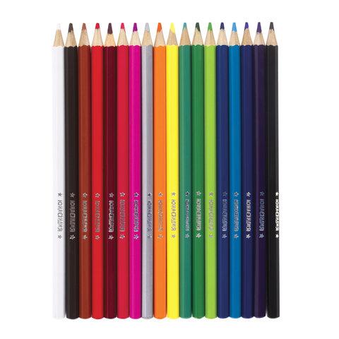 Набор состоит из 18 цветов: белый, красный, алый, розовый, пурпурный, желтый, канареечный, оранжевый, персиковый, салатовый, зеленый, темно-зеленый, голубой, синий, фиолетовый, коричневый, серый, черный. Яркие цвета развивают цветовосприятие ребенка. Шестигранная форма сечения корпуса позволяет не скатываться карандашу с поверхности стола во время занятий рисованием. Они изготовлены из древесины ценных пород и имеют лакированный корпус. Высокосортная древесина и качество исполнения гарантируют легкую заточку. Мягкий грифель качества «А» с диаметром 3 мм обладает повышенной прочностью, не ломается и не крошится при заточке. Все карандаши заточены и поставляются в картонной упаковке с европодвесом.