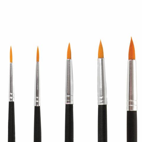 Кисти из синтетических волокон отлично впитывают и отдают краску, хорошо держат форму, долговечны и надежны. Кисти №1, 2, 3 подходят для проработки мелких деталей. Кисти №4 и 5 позволят прорисовывать более крупные детали и наносить широкие мазки и линии. Деревянную крашеную рукоятку кисти удобно держать в руке.