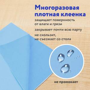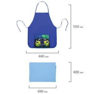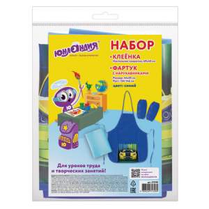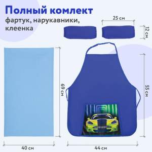 Фартук с нарукавниками выполнен из плотного полиэстера с водоотталкивающей пропиткой, который защитит одежду от загрязнений в процессе занятий. В наборе имеется клеенка для защиты рабочей поверхности. Материал клеенки — ПВХ.