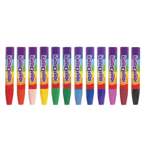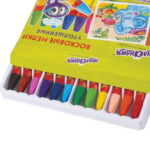 Палитра состоит из 12 ярких и насыщенных цветов. Полностью безопасны в использовании, не токсичны и не имеют резкого запаха. Благодаря своему составу карандаши пишут мягко, и ребенку не придется прикладывать усилия в процессе рисования. Утолщенная шестигранная форма корпуса и диаметр 11 мм делают их еще более удобными для тренировки руки к письму у детей, формируют навык правильного захвата, снижают нагрузку на кисти рук, отлично развивают мелкую моторику. Каждый карандаш завернут в бумажную этикетку, что предохраняет от загрязнений, снижает скольжение, увеличивает прочность. Восковые карандаши упакованы в картонную коробку с европодвесом.