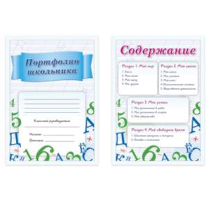 Портфолио школьника формата А4 вмещает до 16 листов. Материал обложки — мелованный картон, материал вкладыша — мелованная бумага. Имеет титульный лист, содержание и состоит из 4 разделов. 1 раздел – Мой мир, который содержит темы: Это я, Моя семья, Мой город, Мои друзья. 2 раздел – Моя школа который содержит темы: Моя школа, Мои учителя, Мой класс, Дополнительные занятия, Общественная деятельность. 3 раздел – Мои успехи в который входят темы: Достижения в учебе, Достижения в спорте, Мое творчество. 4 раздел – Мое свободное время который содержит темы: Школьные праздники и экскурсии, Отзывы и пожелания.