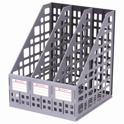 Выполнен в сером цвете с тремя отделениями. Предназначен для хранения каталогов и папок. Представляет собой прочную устойчивую сборную конструкцию с сетчатыми боковыми стенками. Изготовлен из полистирола. Размеры: высота — 295 мм, ширина — 240 мм, глубина — 250 мм.