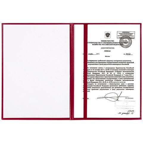 Изготовлена из прочного картона, покрытого бумвинилом. Папка формата А4 универсального назначения выполнена в насыщенном бордовом цвете. На обложке - герб РФ, нанесенный с помощью золотого тиснения. Снабжена лентой для удержания документов (ляссе). Предусмотрено нанесение логотипа.