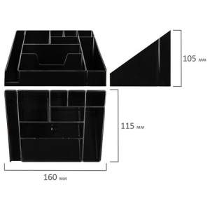 Изготовлена из высококачественного пластика. Имеет размеры 115х160х105 мм. Состоит из 9-ти отделений для канцелярских мелочей и пишущих принадлежностей. Поставляется без наполнения.
