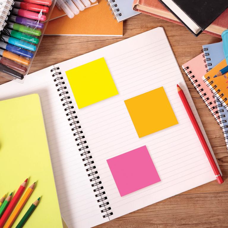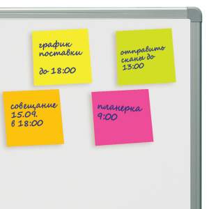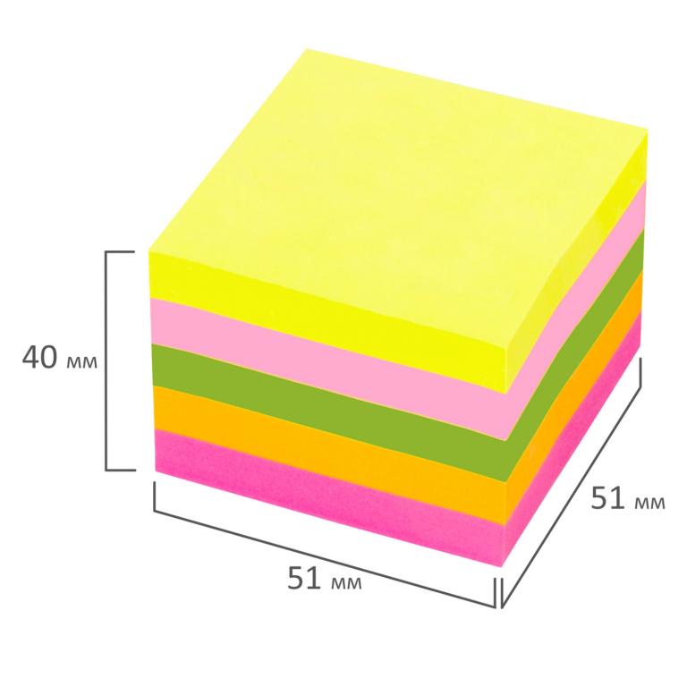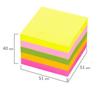 Бумага для записи с клеевым краемм имеет 5 неоновых цветов (желтый, розовый, зелёный, оранжевый, малиновый) в форме куба 51×51 мм состоят из 400 листов. Плотность бумаги составляет 75 г/м2. Клейкий слой - 22 Н/м. Легко клеятся к любой поверхности. Не оставляют следов. Упакованы в полиэтиленовую пленку.
