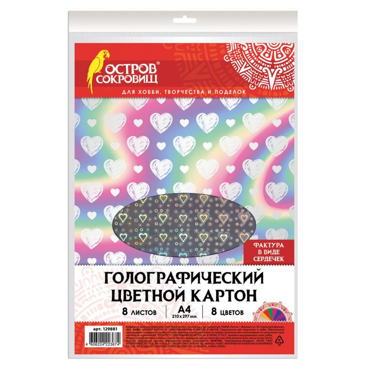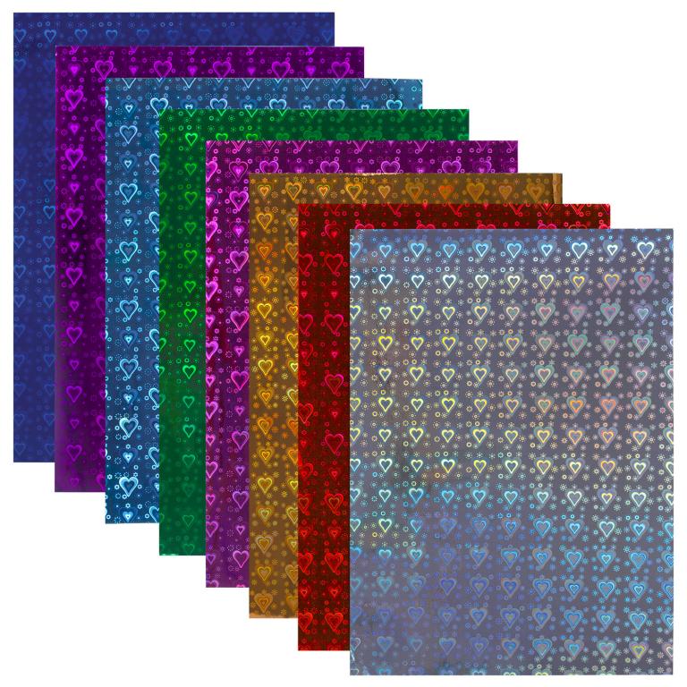 Голографический картон с рисунком «сердечки» обладает плотностью 230 г/м2. Может использоваться, начиная с трехлетнего возраста. Картон легко режется ножницами, сгибается и клеится. Внутренний блок состоит из 8 листов формата А4 (200×297 мм) и 8 цветов.